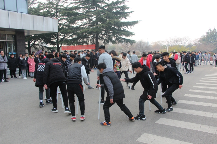 系部员工会组织的“齐心协力 不倒森林”团队协作游戏在系门口拉开帷幕,参赛队员们一边有节奏地绕圈,一边用手把持着“树木”,一个又一个班级员工的精彩比赛赢得观众的阵阵掌声。