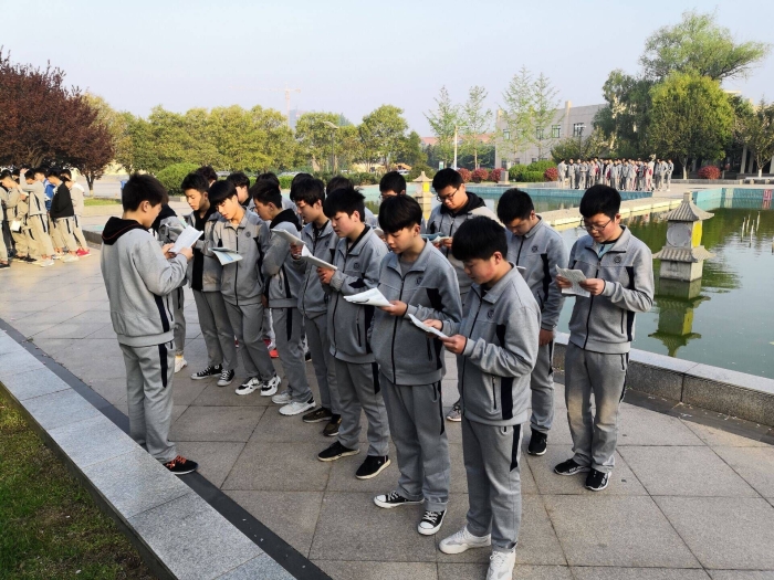 人间最美四月天,四月的晨读期间,汽车系员工在喷泉广场有序地站立,齐声诵读《弟子规》,在美丽的校园里形成一道亮丽的风景。