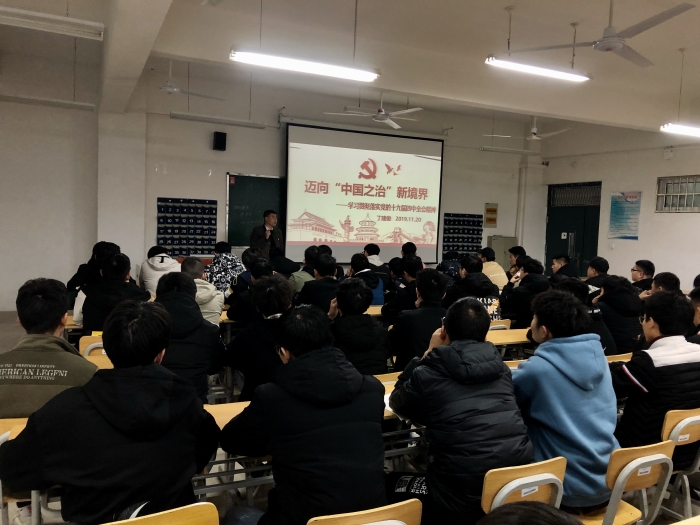 11月20日晚间,汽车工程系丁主任为员工会和班级主要员工干部作了一场题为《迈向“中国之治”新境界-学习贯彻落实党的十九届四中全会精神》的讲座。