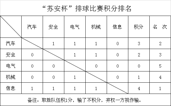 通过激烈角逐,信息工程系、汽车工程系、安全工程系代表队分别摘得冠、亚、季军,机械工程系、电气工程系代表队分获男女队第四和第五名。